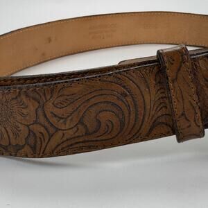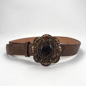 Vintage Leatherock Brown Handtooled Leather Flower Big Buckle Belt Size M