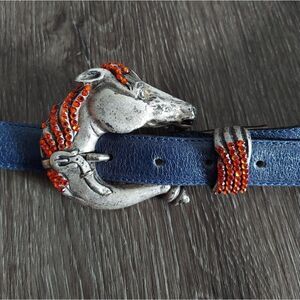 Gorgeous belt with a horse face buckle. Orange rhinestones. (missing one)