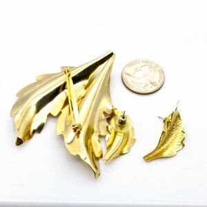 Vintage Leaves Parure, Gold Tone Textured Leaves Brooch and Matching Stud Earrings