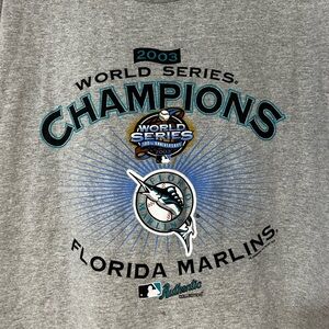 Show off your love for the Florida Marlins with this vintage Lee t-shirt from 2003. This gray shirt features the team's World Series Champions rings and is officially licensed by Major League Baseball. Perfect for any unisex adult fan.