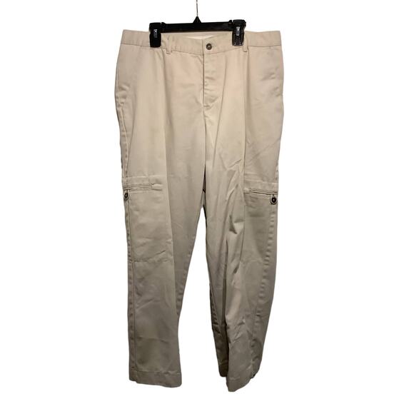 Lee Casuals Men’s beige pants. Has two buttoned pockets half way down the pant legs.