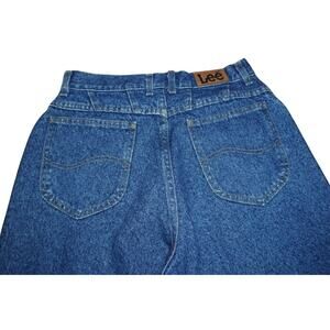 Classic vintage Lee high-rise jeans in a medium wash. These jeans are made in the USA from durable 100% cotton denim, featuring a flattering tapered leg, zip fly with metal Lee button, and signature branding at the pocket and back patch. True vintage ‘90s fit with no stretch — built to last.