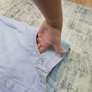 Condition: Good pre-owned vintage condition with light overall wear and one small faint mark on the back right leg, as shown in photos. No rips or holes. Some minor seam wear at hem and button hole fraying seen in close-ups.