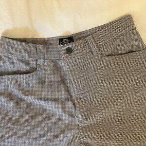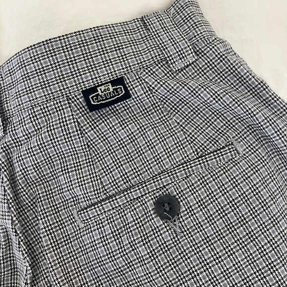 Lee Casuals, mini-plaid/houndstooth pattern, vintage size listed "8 Medium," but waistband across is 27". No stretch. Four pockets.