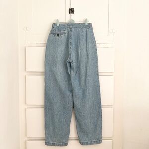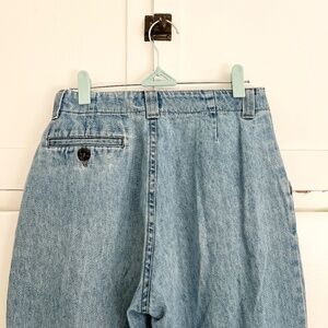 Early 90s denim with a relaxed, easy fit through the hips and thighs and a gently tapered leg. Features rare slanted button-tab pockets, welt back pocket, and made in USA construction. Perfect mom-jean silhouette with that soft, true-vintage denim drape.