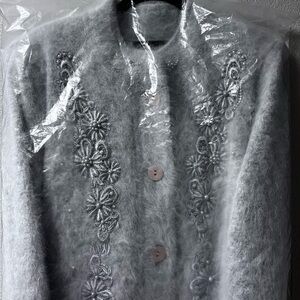 A truly stunning vintage Lee Sands cardigan featuring intricate pearl-beaded floral embroidery on luxuriously soft rabbit angora blend. This rare Korean-made piece embodies retro elegance with a modern cult appeal — perfect for collectors or anyone seeking standout vintage knitwear.