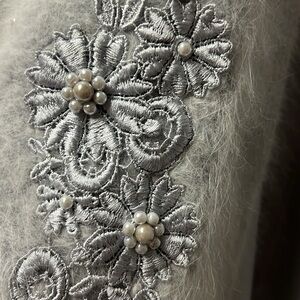 Vintage Lee Sands Angora Cardigan–Pearl Beaded Floral Embroidery–Made in Korea