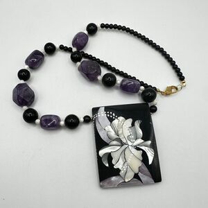 Vintage Lee Sands Black beads, Amethyst, Mother of Pearl Flower necklace!