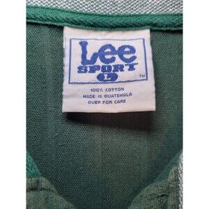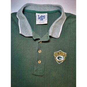 Show off your love for the Green Bay Packers with this vintage Lee Sports polo shirt. The collared neckline and button closure make it the perfect addition to any casual outfit. The shirt is made from a comfortable cotton blend knit fabric, with a solid green pattern and a light fabric wash. Whether you're heading to a football game or just running errands, this shirt is a must-have for any Packers fan.