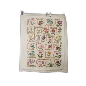 Features: Hand-stitched sampler with full AZ floral names; edges are unfinished/raw; ideal for framing, wall decor, or craft projects