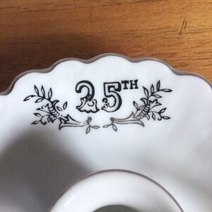 These exquisite 25th Anniversary Lefton candle holders feature a harmonious blend of white porcelain and intricate silver accents. The elegant silver detailing adds a touch of sophistication, making them ideal for enhancing any formal setting. Perfect for creating a refined and classic ambiance in your home. Each piece measures approximately 4 1/2” in diameter. Great vintage condition. No chips, cracks or repairs. Smoke free home.