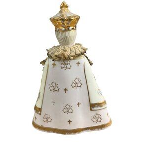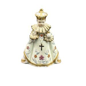 This hand-painted porcelain figurine depicts the Infant of Prague in intricate detail, featuring a gold crown and floral accents that enhance its elegance.
