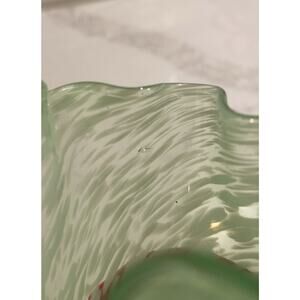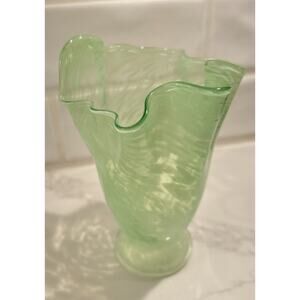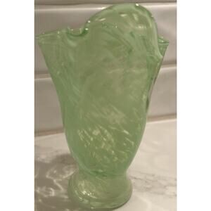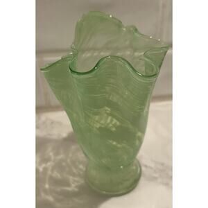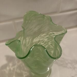 Very pretty green swirl ruffled top vase. Top graduated ruffled design. No chips or cracks. There is a glass bubble that is made in the glass and is not a defect.
