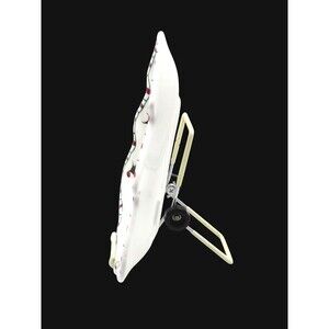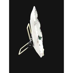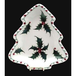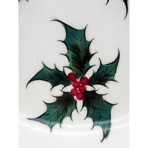 Holly, Red Berries and a Candy Cane Border. The Dish measures approx. 8 1/4" long x 7 1/2" wide by 1" high. The stand shown in the pictures is not included in this sale.