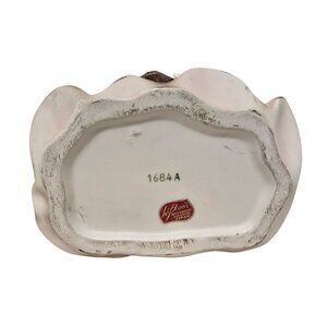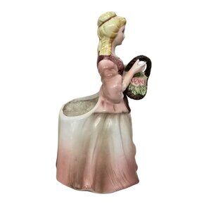 This ceramic planter features a finely detailed vintage lady holding a basket. Crafted by Lefton, it's a charming decorative piece for any space.