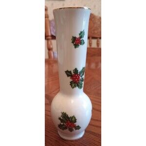 Vintage Lefton Porcelain Christmas bud vase. Features holly and berries. Gold rimmed. Stands 6.5 inches tall.