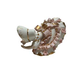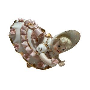 These vintage Lefton porcelain Southern Belle figurines are exquisitely crafted, featuring intricate pink ruffled dresses adorned with delicate floral accents and elegant gold trim. Ideal for collectors, these charming figurines capture the essence of southern grace and charm, making them a sophisticated addition to any decor.