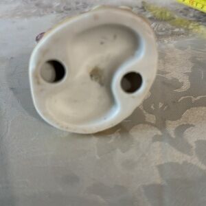 The figurine features a brown bear with a white face and pink ears, holding a flower, and a blue bird resting beside it on a green base with small flowers. Lefton figurines are considered collectible and are sought after by those who appreciate vintage ceramic items and animal-themed decor