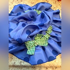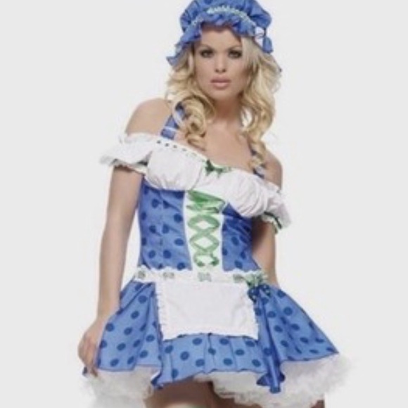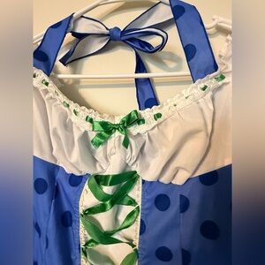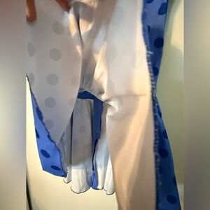 Charming blue polka dot kids costume with white accents. Perfect for dress-up and imaginative play. Please see all pictures first few are stock photos. This does not come with tights or the petty coat just the dress and the hat. Smoke free, pet friendly House. This costume is gently worn is not in perfect condition. There is a stain in the front of the inside of the dress pictured. It is not seen when wearing it is from makeup and the hat has a small crease also pictured that can probably be ironed out.