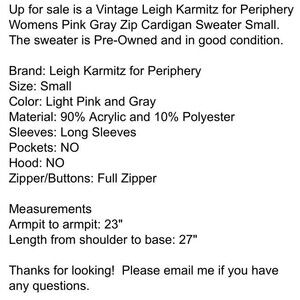 Up for sale is a Vintage Leigh Karmitz for Periphery womens zip cardigan sweater in light pink and gray.