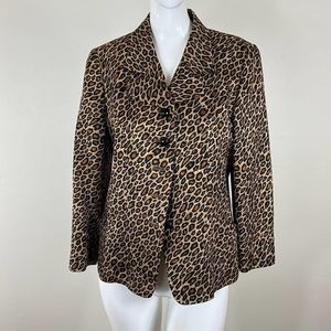 This hard-to-find, unique Leilian jacket is leopard print with five buttons and two front pockets. Preowned in excellent condition this statement piece is an original jacket with built-in shoulder pads.