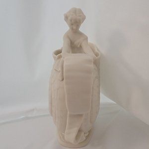 Cherub with ribbon handle on top of the Nautilus shell vase.