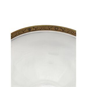 1 Pre-owned Elegant clear crystal round bowl with a wide encrusted gold band around the rim, standing approximately 4.75" tall and about 6.5" in diameter. Made in USA around the 1980s to 1990s era. Classic vintage look with detailed scrollwork on the band and light surface wear consistent with age, ideal as a centerpiece or serving bowl. Dish is in excellent condition with minor signs of use. No visible cracks or imperfections. Stored in a smoke-free home. Ready to ship! Always down to bundle items together. Lots of experience shipping fragile glass items. Feel free to reach out with any questions or offers!