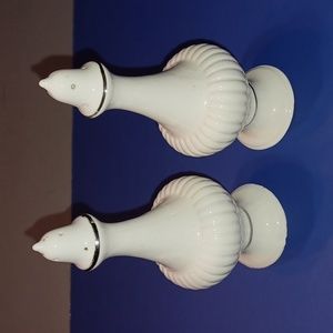Vintage Lenox Essex Salt and Pepper shakers. Gorgeous, white ceramic shakers with silver trim. Good usable, vintage condition! Smoke free home! Packaged to arrive safely. FAST SHIPPING! THANK YOU!