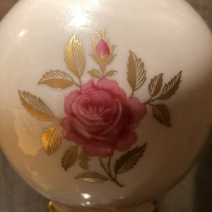 Gold, trim detail in center and base with a beautiful single pink rose and a golden crusted bud are such a delicate statement.