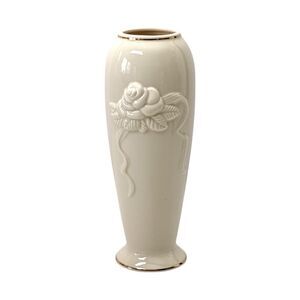 1. Lenox Rosebud Collection Cream Vases: This pair of vases features a beautiful raised rosebud design and delicate gold trim. Made between 1984-1986, they measure 5" and 7" in height, ideal for displaying on a table or mantel.