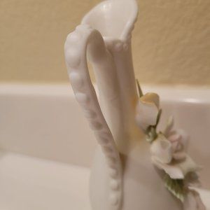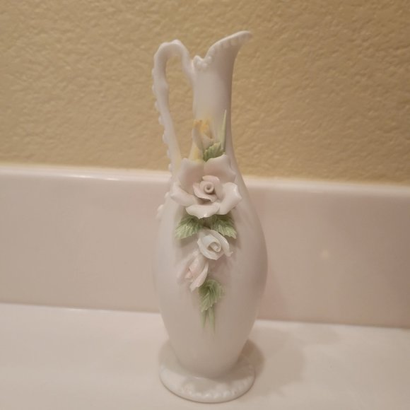 Lenwile China Ardalt Japan Verithin Handmade Single Handle Flower Pitcher (7407). Elegant vintage porcelain bisque bud vase pitcher. Hand painted very pale pink with gorgeous pale lavender, pink, and yellow ceramic roses and green leaves. Believe these are Lotus Flowers lightly painted on just the tips...delicate painting technique. Beautiful vase ~ 7-1/4" tall and 2-1/4" diameter
