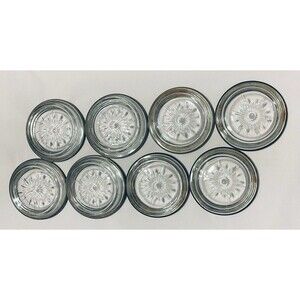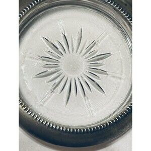 Set of 8 vintage Leonard Italy glass coasters featuring silverplate rims and a classic starburst design.