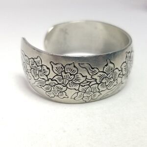 Vintage Leonard Pewter Floral Design Cuff Bangle Bracelet, Silver Tone, Signed