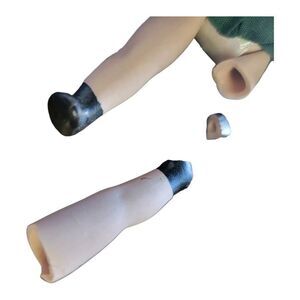 Good used condition! Leg/foot can possibly be glued back on. Hat/hair also needs to be glued back on girl(see photos)