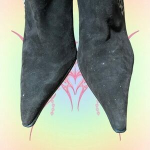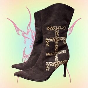 Vintage Lerre Mid-Calf Pointed Toe Brown Boots with Leopard Details Stiletto Heel Suede Feel