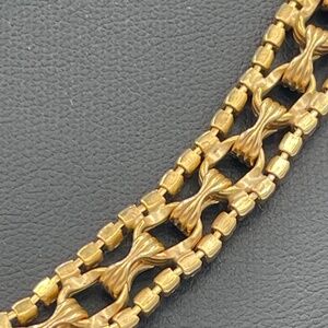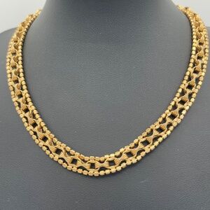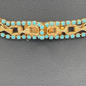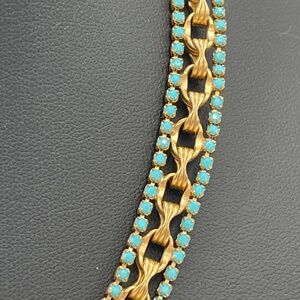 This stunning vintage Les Bernard necklace features a 15-inch gold tone collar with faux turquoise stones. Perfect for adding a touch of elegance to any outfit, this piece is a timeless accessory for your jewelry collection.