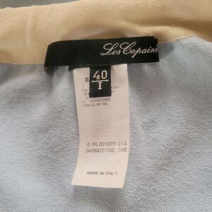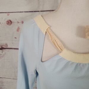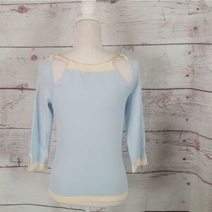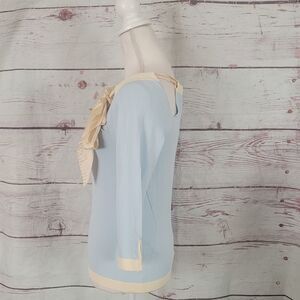 Baby blue top with cream color scarf tie neckline. Tie has matching blue stitching. Beautiful, elegant top. In very good condition.