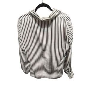 The black and white striped pattern gives the blouse a classic look, while the long sleeves and classic fit provide a comfortable and timeless fit. This blouse is a size 12 and has a button-down style, perfect for any 80s or vintage lover. It is also unlined and packable, making it easy to take on the go. Add this versatile piece to your wardrobe today!
