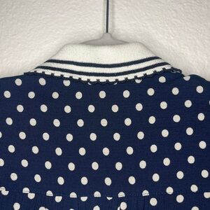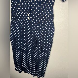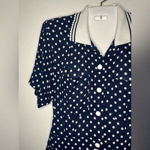 Features a classic navy base with white polka dots, a structured contrast collar with stripe detail, and a flattering pleated midi skirt. Front button-down closure, bust pockets, and yesβit has side pockets! π