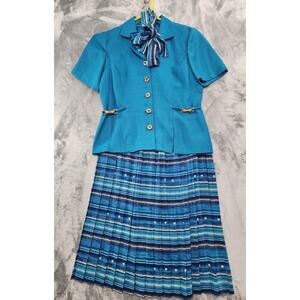 Vintage Leslie Fay Short Sleeve Blazer Striped Pleated Skirt Set Size 12 Blue