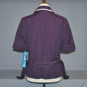 vintage Leslie Fay, skirt set, midi skirt, two piece set, matching set, NWT, new with tags, retro, mod, button down shirt, blouse, belted blouse, purple, white, plum, dark purple, royal purple, tie waist belt, tie belt blouse, collared blouse, short sleeve, piping, embellished, cuff sleeve, half sleeve, deadstock, dead stock, 60s, 1960s, 70s, 1970s, 80s, 1980s, grannycore, casual, party, spring, summer, fall, autumn, size 6, size 7, size 8, momcore, chic, MCM, Ann Taylor, Chico's, Talbots, classic, Joan Leslie, Saks Fifth Avenue, Macy's, true vintage, women's vintage clothing, retro clothing, secretary, office, teacher, day date, sweet, charming,