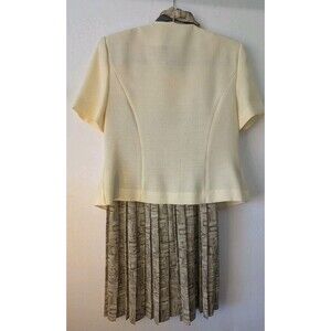 Vintage Leslie Fay Suit is a 3-piece set perfect for a casual or business occasion in the summer or fall seasons. The beige jacket with embroidered lapel features short sleeves, while the skirt and scarf add a classic touch to the outfit. Made of lightweight polyester fabric, this mid-length jacket and elastic waist pleated skirt make it a comfortable and stylish choice for business or casual style.