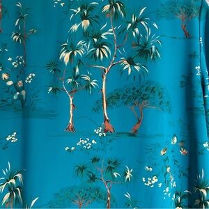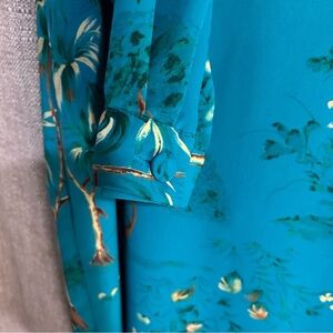 Step back into timeless style with this vintage Leslie Fay shirt dress. Features a bold teal background with an all-over tropical palm tree and floral print, button-down front, long sleeves with button cuffs, and a collared neckline. Made in El Salvador. Classic and unique, perfect as a statement dress or styled open as a duster.