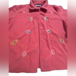 Vintage Leslie Fay women's coral button-up embroidered polyester blazer jacket in size 3XL. This mid-length jacket features a 3/4 sleeve with a colorful leaves pattern on a pink flannel fabric. It has a classic fit, button closure, and is lined with polyester. The retro-style jacket has a collared neckline and is perfect for casual occasions in all seasons.