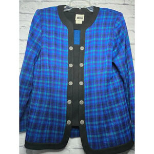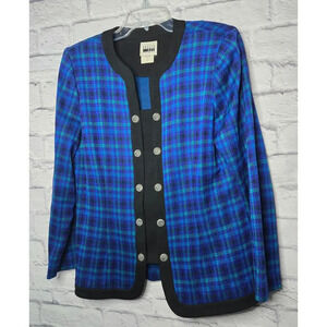 Vintage Leslie Fay plaid gingham black and blue blazer jacket size 12 (large). Such a stunning blazer, love this color blue! Has beautiful silver buttons and shoulder pads (can be removed). Perfect for to wear to work at the office or even style it up for a night out, definitely a statement piece. Missing material tag.
