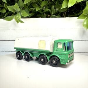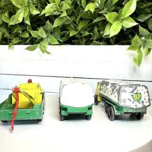 Lot of 3 vintage well-loved Lesney Matchbox BP vehicles from the 1970s including two different tanker trucks and a tow truck. Made of diecast material in various multi-color designs, these miniature vehicles are part of the classic Matchbox series. Made in England by Lesney.