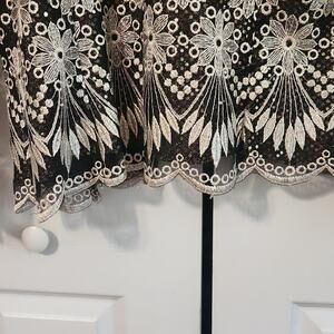The pictures do not do this jacket justice. It just shimmers in the light. Black mesh with silver embroidery. Gold dots on the underneath. Shoulder pads. Scalloped hem & cuffs. Stunning piece! EUC