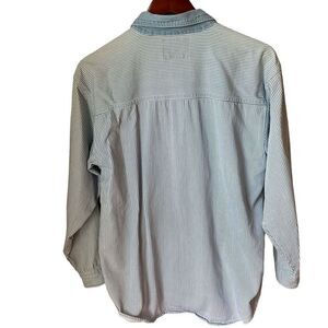 Vintage embroidered striped long sleeve button up. Medium super detailed autumn scene with windmills, milkmen and trees! Oversized casual striped button down with denim collar. Excellent vintage condition. 100% cotton. Flat lay 29” L, 21” P-P. #cottagecore #prairiecore #vintage