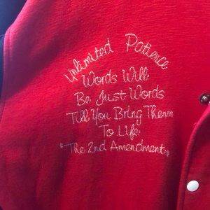 Red white and black letterman’s jacket, moderately used, button and zipper in the front, 2 exterior pockets small stains on front smaller than the size of a penny.