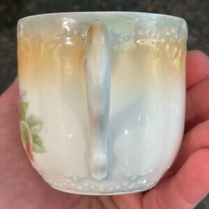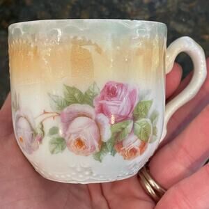 Glossy; floral; lustre; espresso?; demitasse?; peach colored accents; bone China; porcelain